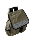Børnerygsæk i navygrøn med sorte detaljer, og en lang reflex på forsiden. Små rum er fordelt rundt på ydersiden af tasken.