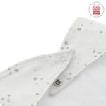 Bandana savleklud Hvid m. stjerner 38x18cm Med trykknap man kan regulere i 2 størrelser. form trekantet. Rigtig god til når barnet får tænder, så han/hun ikke bliver våd på tøjet. Stykket der vender ind mod barnet er 100% bomuld, så det også er behageligt.
