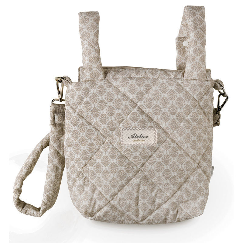 Pusletaske til at sætte fast på barnevognen Beige 12x40x35cm En håndtaske i god størrelse, både for mor og barn. Den kan hæge på klapvogn/barnevogn. den har hank og skulderstrop. Produceret i Spanien.